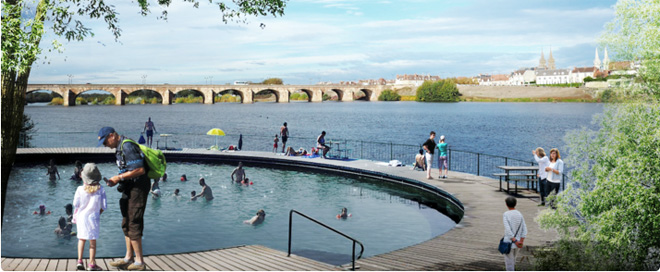 C'est bientôt le retour de la baignade dans l'Allier ! A deux pas du centre-ville, la plaine du camping, ouverte et arborée, sera équipée de tables de pique-nique et de jeux pour enfants. Elle retrouvera aussi son usage d'antan de plage de Moulins. Pour répondre à la grande attente des habitants, le projet prévoit d'aménager un équipement singulier et attractif de baignade dans l'Allier.